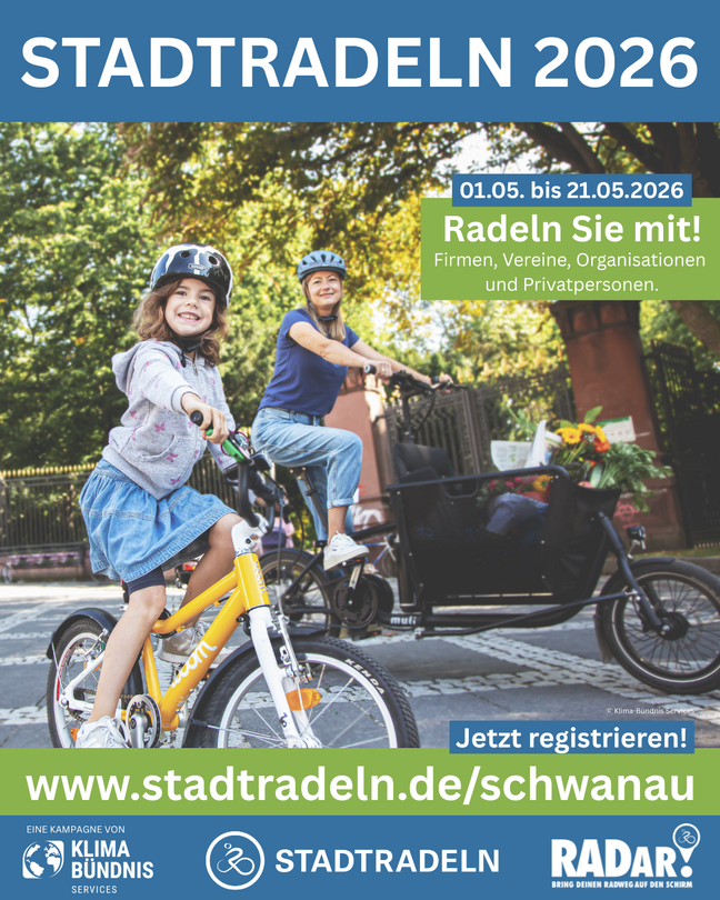 In diesem Jahr nimmt die Gemeinde Schwanau zum dritten Mal beim STADTRADELN teil, das im gesamten Ortenaukreis vom 01.05. - 21.05.2026 stattfinden wird. Ziel ist es, an 21 Tagen möglichst viele Kilometer CO²-frei mit dem Rad zurücklegen, für das Klima, für saubere Luft, für weniger Lärm, für eine nachhaltige Verkehrspolitik und für die eigene Fitness.