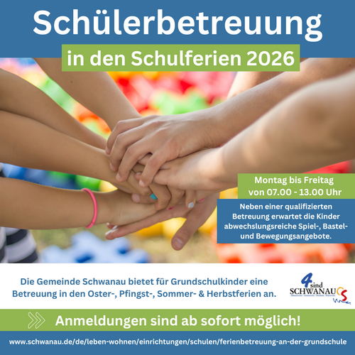 Die Gemeinde Schwanau bietet für Grundschulkinder eine Betreuung in den Osterferien, Pfingstferien, Sommerferien und Herbstferien an. Die Ferienbetreuung wird ausschließlich für Kinder angeboten, welche die 1. bis 4. Klasse einer Grundschule besuchen und in der Gemeinde Schwanau wohnen. Für die Kinder stehen Spiel-, Bastel- und Bewegungsangebote bereit.