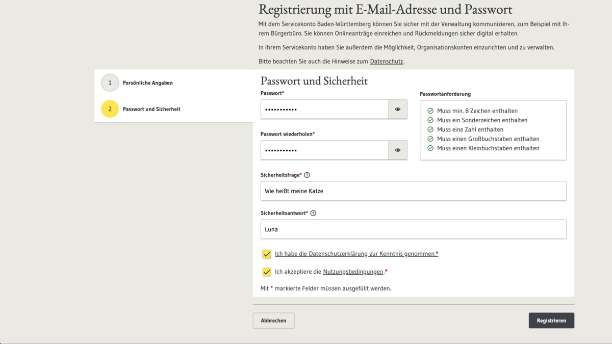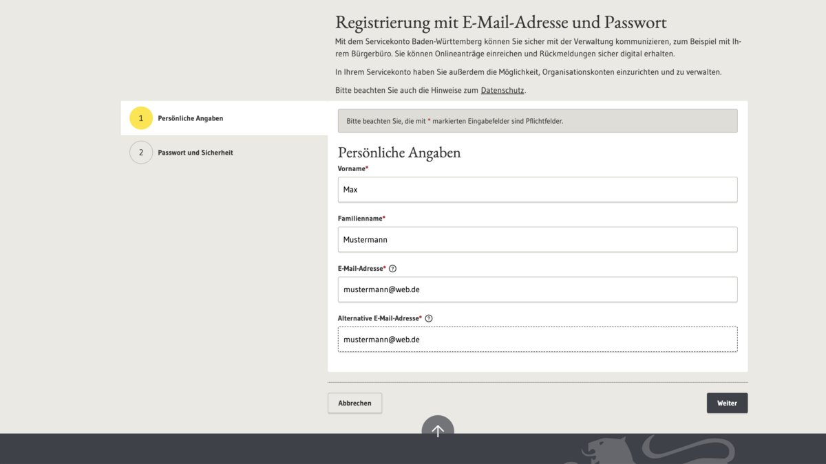 Unten aufgeführt finden Sie eine Schritt-für-Schritt Anleitung für die Registrierung eines Servicekontos bei Service-BW.